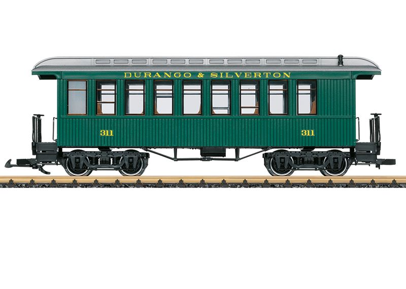 Modell des Oldtimer-Personenwagens Nr. 311 der Durango & Silverton Railroad in der dunkelgrünen Lackierung. Originalgetreue Farbgebung und Beschriftung der Epoche VI. Türen zum Öffnen, vollständige Inneneinrichtung. Metallradsätze.