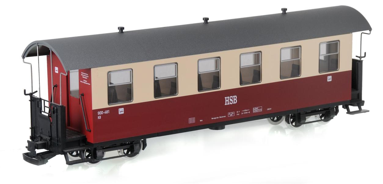 G HSB Personenwagen 6 Fenster 900-444 Länge über Puffer (LüP): 530 mm Lieferumfang: Beipacktüte(2x Kupplungshaken/ 2x Bolzen/ 2x Bremskurbel) Maßstab: 1:22,5 Spurweite: 45 mm Hersteller: Train-Line