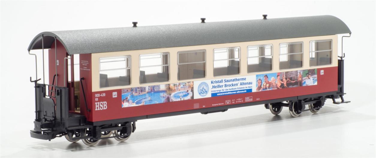 G HSB Personenwagen 900-439 "Kristalltherme Altenau" Länge über Puffer (LüP): 600mm Lieferumfang: Beipacktüte(2x Kupplungshaken/ 2x Bolzen/ 2x Bremskurbel) Maßstab: 1:22,5 Spurweite: 45 mm Herst...
