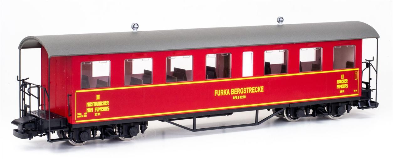 G Personenwagen B 4229 der Furka Bergstrecke, rot Länge über Puffer (LüP): 625 mm Lieferumfang: Beipacktüte (2x Kupplungshaken/2x Bolzen/2x Bremskurbel/2x Bühnengitter) Maßstab: 1:22,5 Spurweite:...