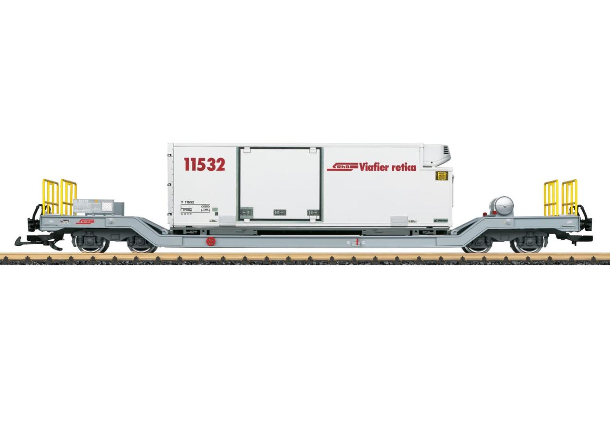 Bei den meisten Bahnen wird heute ein Großteil des Güterverkehrs mit Containern abgewickelt, so auch bei der Rhätischen Bahn in Graubünden. Da auf der Schmalspurbahn ja die gleichen Container verladen werden müssen wie auf der Normalspurbahn, war eine besondere Bauart erforderlich: die Ladefläche ist zwischen den Drehgestellen abgesenkt, damit der Wagen mit aufgeladenem Container das Lichtraumprofil nicht überschreitet. Neben Containern können auf diesen Wagen aber auch Transportgestelle - zum Beispiel für Stammholz - verladen werden, die dann komplett entweder auf Normalspurwagen oder - für die letzten Kilometer bis zum Ziel - auf einen LKW umgesetzt werden können. Bei diesen Wagen gibt es verschiedene Bauarten, vor allem bei der Anordnung der Handbremse: Bei den einen Wagen ist eine Handbremskurbel auf der Bremserbühne montiert, bei anderen ist ein großes Handrad zur Betätigung der Bremse seitlich am Rahmen montiert.