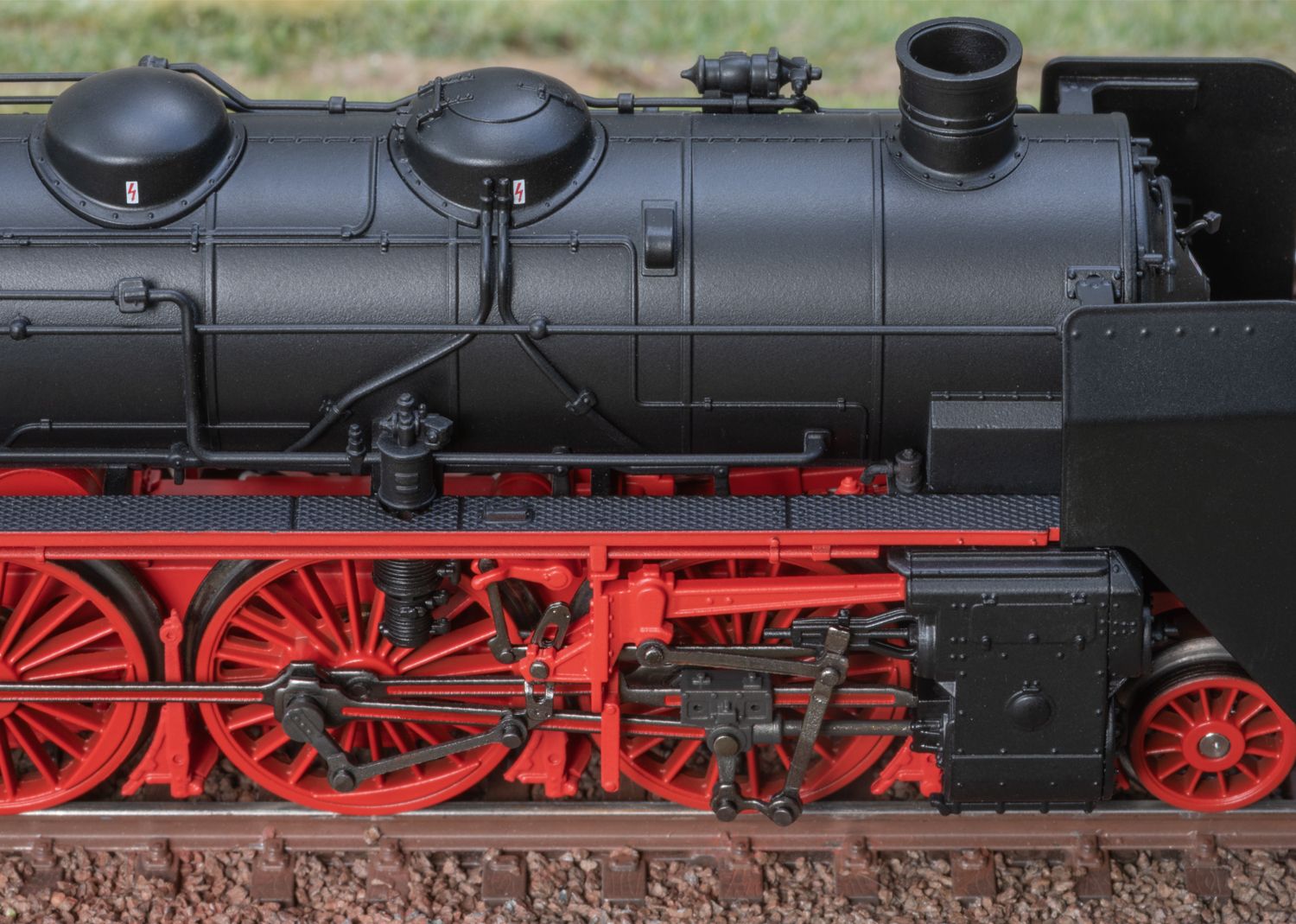 Modell: Mit Digital-Decoder und umfangreichen Geräuschfunktionen. Geregelter Hochleistungsantrieb mit Schwungmasse im Kessel. 4 Achsen angetrieben. Haftreifen. Lokomotive und Tender weitgehend aus Metall. Serienmäßig eingebauter Raucheinsatz, mit geschwindigkeitsabhängigem, dynamischem Rauchausstoß. Fahrtrichtungsabhängig wechselndes Zweilicht-Spitzensignal konventionell in Betrieb, digital schaltbar. Führerstandbeleuchtung und Feuerbüchsenflackern jeweils separat digital schaltbar. Beleuchtung mit wartungsfreien warmweißen und roten Leuchtdioden (LED). Mit Pufferspeicher. Schwenkbare Führerstandtüren und Imitation der Vorhänge zwischen Führerstand und Tender. Kurzkupplung mit Kinematik zwischen Lok und Tender. Am Tender kinematikgeführte Kurzkupplung mit NEM-Schacht. Pufferhöhe an Lok und Tender nach NEM. Befahrbarer Mindestradius R2 437,5 mm. Kolbenstangenschutzrohre und Bremsschläuche liegen bei. Länge über Puffer 26,0 cm. Hinweis: Ab Werk für Mindestradius R 2 (437,5 mm) spezifiziert; bei vorsichtiger/ reduzierter Fahrweise ist der Betrieb auf R 1 (ca. 360 mm) möglich.