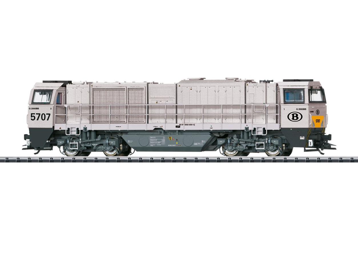 Vorbild: Schwere Diesellokomotive Vossloh G 2000 BB mit symetrischem Führerhaus. Lokomotive der ATC AngelTrainsCargo, Antwerpen, als Serie 57 vermietet an die Belgischen Staatsbahnen (SNCB). Lichtgrau/grüne Grundfarbgebung mit umbragrauem Rahmen. Lok-Betriebsnummer 5707. Betriebszustand um 2011.<br>Modell: Mit Digital-Decoder und umfangreichen Geräusch- und Lichtfunktionen. Geregelter Hochleistungsantrieb mit Schwungmasse zentral eingebaut. Alle 4 Achsen über Kardan angetrieben. Haftreifen. Fahrtrichtungsabhängig wechselndes Dreilicht-Spitzensignal und 2 rote Schlusslichter konventionell in Betrieb, digital schaltbar. Spitzensignal an Lokseite 2 und 1 jeweils separat digital abschaltbar. Wenn Spitzensignal an beiden Lokseiten abgeschaltet ist, dann beidseitige Funktion des Doppel-A-Lichtes. Führerstandbeleuchtung pro Führerstand jeweils separat digital schaltbar. Beleuchtung mit wartungsfreien warmweißen und roten Leuchtdioden (LED). Viele separat angesetzte Details. Längsseitige Geländer am Rahmen aus Metall. Detaillierte Pufferbohle. Ansteckbare Bremsschläuche liegen bei. Beiliegende Frontabdeckungen können zusätzlich an der Pufferbohle montiert werden.Länge über Puffer 20 cm.