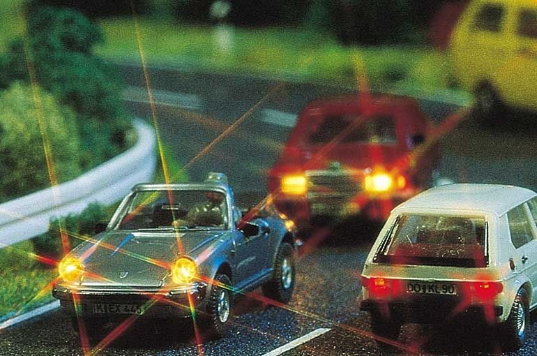 2 weiße Glühlampen und 2 rote Super-Mini-LEDs, einbaufertig (mit Vorwiderständen) für H0-Fahrzeuge.