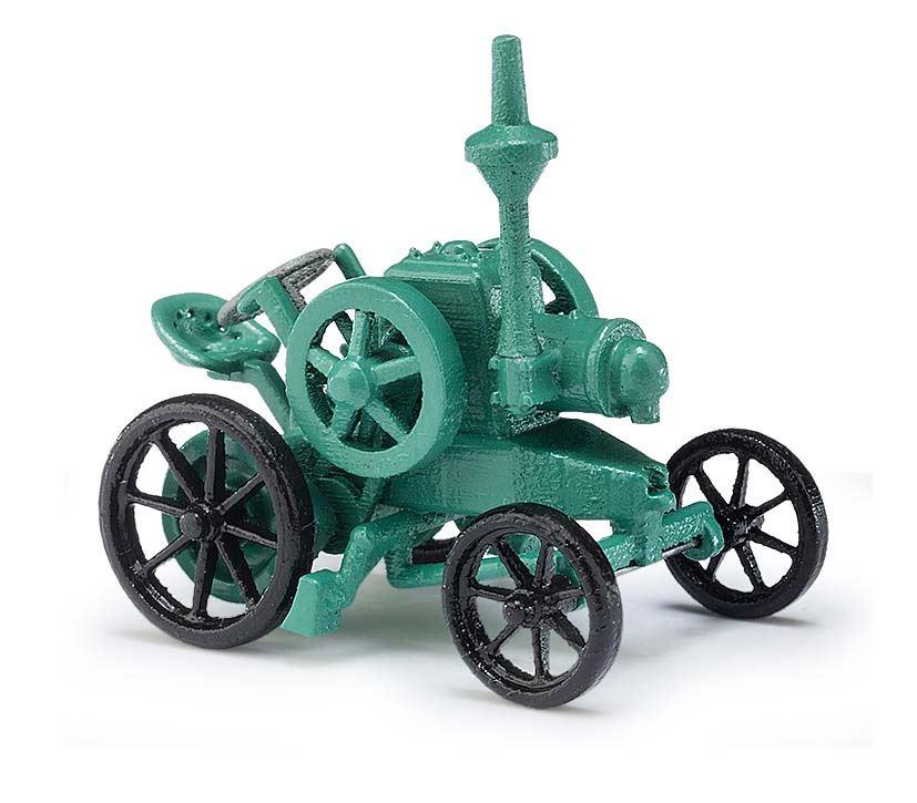 Schwergewicht! Der Gummi-Bulldog aus dem Jahr 1921 ist eine Zugmaschine, die eine Mindestlast von 6 bis 7 Tonnen ziehen kann und dabei eine Geschwindigkeit von 5 bis 6 km pro Stunden zurücklegt. Das ist aus der heutigen Sicht zwar nicht gerade berauschend, für die damalige Zeit allerdings ein großes Novum. Der Gummi Bulldog ersetzte bei Dauerbetrieb zwei Gespanne und war daher in seinen Betriebskosten weitaus billiger. Die Vorzüge des Bulldogs wie: Einfachheit der Konstruktion, Einfachheit der Bedienung, stete Betriebsbereitschaft und große Betriebssicherheit wurden als Verkaufsargumente genutzt - Argumente, die der Realität entsprachen. Die Verwendungs-möglichkeit des Bulldogs lag aber nicht nur im Fahrbetrieb sondern auch als Antriebskraft für Maschinen in der Industrie, des Gewerbes und der Landwirtschaft. So fand er hauptsächlich seinen Einsatz in Sägereien, Holzhandlungen, Ziegeleien, Kohlenhandlungen, Speditionen, Brauereien, Baubetrieben uvm. Der Brennkraftstoffverbrauch lag bei 11/2 – 2 kg pro Stunde, je nach Güte des Brennstoffs, Schmierölverbrauch lag bei ca. 100 g pro Stunde, die Betriebsbereitschaft innerhalb von 2 – 3 Minuten unter Volllast. Das super filigrane Modell des Bulldogs besticht durch die vielen kleinen Details und ist ein wahres Kunstwerk, das auf keinem Schaustück fehlen sollte.