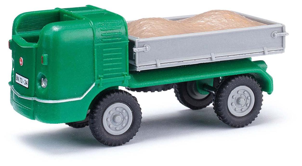 Grünes Multicar mit Kiesladung. Das futuristisch wirkende Multicar M21 wurde von 1956-1964 in Waltershausen (DDR) hergestellt. Der M21 verfügt über einen 1-Zylinder Dieselmotor Verdampfer und erbringt eine Leistung von 6,5 PS. Auch wenn es nicht ganz so schnell von statten geht, er bewegt immerhin eine Nutzlast von 2t. Eingesetzt wurde er fast überall im Osten Deutschlands und auch noch heute sind vereinzelt Exemplare des M21 im Einsatz.