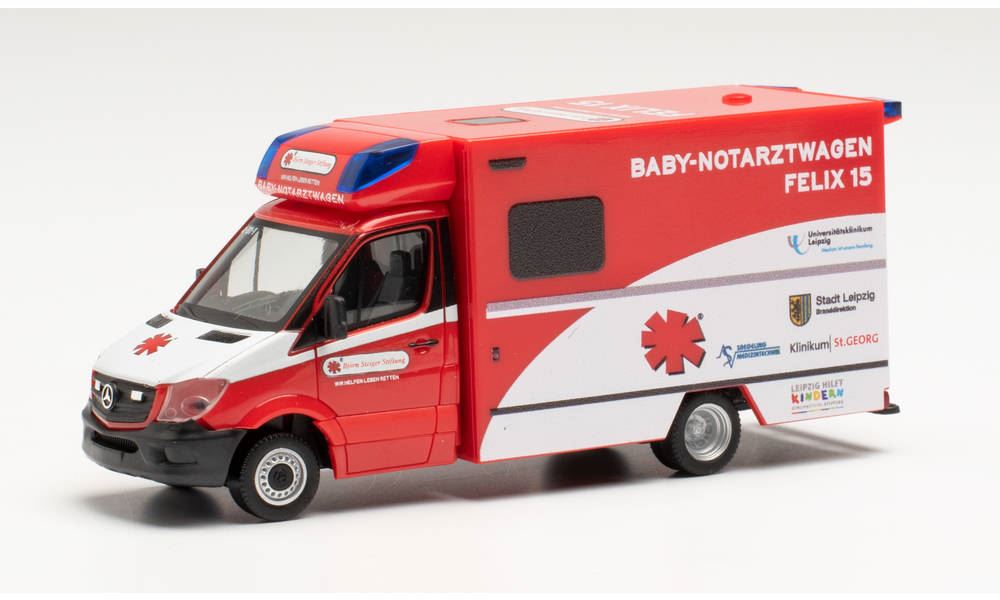 H0 MERCEDES-BENZ SPRINTER `13 FAHRTEC RTW "BABY NOTARZT FELIX 15, KLINIKUM ST. GEORG LEIPZIG" In Leipzig wird ein Mercedes-Benz Sprinter `13 als Baby Notarztwagen eingesetzt. Das farblich markant ...