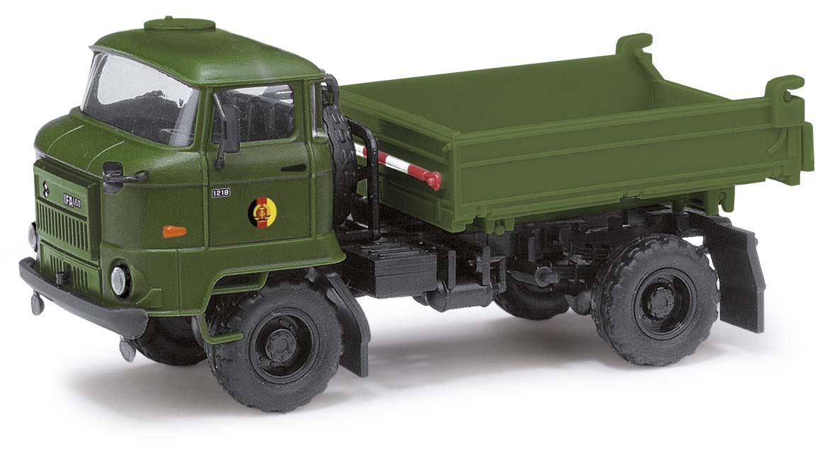 Der Dreiseitenkipper (3SK) auf L60-Fahrgestell wurde aufgrund seiner guten Geländetauglichkeit auch bei der Nationalen Volksarmee eingesetzt. Er eignete sich zum Transport von Aushub und kam beispielsweise bei Pioniereinheiten zum Einsatz. Die Fahrzeuge wurden nach dem Ende der DDR an Feuerwehren, das THW oder an landwirtschaftliche Betriebe abgegeben. 25 Jahre »Mauerfall« <br>Mehr als 28 Jahre lang war Berlin West im Würgegriff der befestigten Staatsgrenze zur DDR. Der Beschluss zum Mauerbau war damals Staatsgeheimnis und wurde erst am 10. August 1961, drei Tage vor Beginn dieses furchtbaren Mammutprojekts bekannt. In dieser Zeit spielten sich furchtbare Szenen ab, kurzfristig versuchten viele Menschen noch in den Westen zu gelangen, Freundschaften und Familien wurden für lange Zeit auseinandergerissen. Ein Leben hinterm »eisernen Vorhang« begann, ein Leben unter ständiger Aufsicht der Stasi (Staatssicherheit) mit Abhör- und Bespitzelungstyrannei wurde zum Alltag. Im Laufe der Jahre, in denen sich ringsum der Fortschritt und die Technik sowie die Lebensqualität und die Freiheit des Menschen nicht mehr vor der unterdrückten Bevölkerung der DDR verbergen lies, kam es immer häufiger zu Fluchtversuchen und Revolten. Viele Politiker versuchten eine Einigkeit zu erwirken, auch Ronald Reagan appellierte zur Öffnung des Brandenburger Tores am 12. Juni 1987 in seiner berühmten Rede. Dann plötzlich geschah es, in der Nacht von Donnerstag 9. November auf Freitag 10. November 1989, die Mauer fällt - die Wende nimmt ihren Lauf. Familien und Freunde, die seit Jahren getrennt waren, können sich endlich wieder in die Arme schließen. Zu diesem unvergesslichen Ereignis haben wir die folgenden Modelle kreiert und auf die Räder gestellt. Alle Modelle dieser Reihe haben einen bunt bedruckten Mauerstein in der Verpackung. Besitzt man alle 14 Modelle und die jeweiligen Mauersteine, so kann man eine zusammenhängende Wandgraffiti zusammenbauen. Damit steht auch hier fortan der Bastel- und Sammelspaß im Vordergrund. Folgende 14 Modelle gehören zu dieser Sammelserie: Weimar Mobil Bagger T174 - 1 »Mauerfall« (Art.-Nr. 42886), Robur LO 2002 A »NVA« (Art.-Nr. 50217), Robur LO 2002 A »NVA Grenztruppe« (Art.-Nr. 50221), Robur LO 2002 A »NVA Grenztruppe« (Art.-Nr. 50222), Lada 1500 »Patrouillier-Fahrzeug« (Art.-Nr. 50506), Lada 1500 »Volkspolizei« (Art.-Nr. 50507), Lada 1500 »Mauerfall« (Art.-Nr. 50509), IFA W50 LA/A »Grenztruppen« (Art.-Nr. 95212), IFA W50 LA TLF16 GMK »Volkspolizei« (Art.-Nr. 95213), IFA W50 LA/A »Bereitschaftspolizei« (Art.-Nr. 95214), IFA W50 LA/A »Kommandantendienst« (Art.-Nr. 95216), IFA W50 LA TLF GMK »NVA« (Art.-Nr. 95218), IFA W50 LA TLF GMK »NVA« in Flecktarnung (Art.-Nr. 95219) und IFA L60 3SK »NVA« (Art.-Nr. 95512).