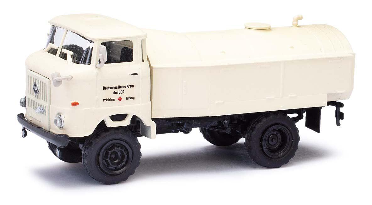 Der Grundtyp einer großen Palette von Nutzfahrzeugen der 5t-Nutzmasseklasse aus Ludwigsfelde war das Pritschenfahrzeug W50L. Seit 1965 gebaut und ständig weiterentwickelt hat sich der 2-achsige Frontlenker bei in- und ausländischen Abnehmern bewährt. Im Jahr 1983 wurde die ABE (Allgemeine Betriebserlaubnis) für das allradgetriebene Pritschenfahrzeug mit der verstärkten Pritsche erteilt. <br><br><br>Als Zugmittel und Transportfahrzeug für Material und Personen war diese Fahrzeugversion unter anderem beim Militär im Einsatz. In Eigenregie wurden bei Instandsetzungen Tankaufbauten vom G5 auch auf die W50 Fahrgestelle gesetzt. Das nachgebildete Fahrzeug war beim Präsidium Hilfszug des Deutschen Roten Kreuzes eingesetzt.