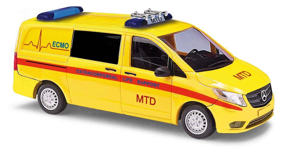 Eurogelbes Einsatzfahrzeug des Medizinischen Transportdienstes Berlin. Das ECMObil (Extracorporale Membrane Oxygenation) hält Geräte bereit, die einen künstlichen Kreislauf aufrechterhalten und den Körper mit Sauerstoff versorgen. Das Fahrzeug mit seinen Gerätschaften wird hauptsächlich zu Patienten gerufen, die einen schweren Schock, Kreislaufstillstand oder ein Lungenversagen haben.