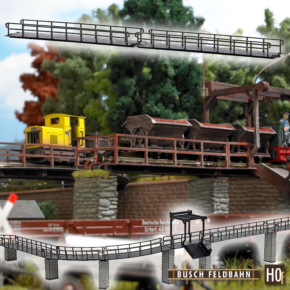 Das Brückensystem passt exakt zu den Busch Feldbahngleisen und bietet unendliche Variationsmöglichkeiten für abwechslungsreichen Fahrbetrieb. Die Stahlbauweise der Brückenelemente ist im Modell hervorragend nachgestellt, die Brückengeländer sind filigran ausgeführt und die Pfosten der Auffahrten sind mit einer realistisch wirkenden Oberfläche in Natursteinoptik ausgestattet. Das Brückensystem ist für Feld-, Gruben- und Industriebahnen universell einsetzbar. Bausatz.