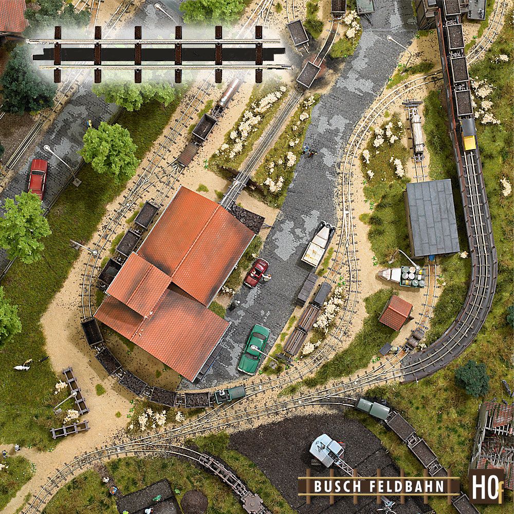 Das H0f Feldbahngleissystem:<br>Das maßstäbliche Feldbahngleissystem in der Spurweite 6,5 mm (entspricht ca. 600 mm im Original) ist eine komplette Neuentwicklung. <br><br>Die Gleise haben den bei Feldbahnen üblichen großen Abstand der Schienenschwellen. Das besondere an diesen Gleisen sind integrierte Metallstreifen, die für den erforderlichen, magnetisch erhöhten Anpressdruck der Loks sorgen. Die Stromaufnahme zwischen den Rädern der Loks und der Schienen wird auf diese Weise verbessert und eine vorbildgerecht langsame und ruckelfreie Fahrt bei hoher Durchzugskraft ermöglicht. Die neuen Feldbahngleise eignen sich dadurch auch für die Grubenbahn von Busch. <br><br>Das Gleissystem bietet zahlreiche Variationsmöglichkeiten für verschiedenste Gleispläne mit abwechslungsreichem Fahrbetrieb und ist auch auf das Busch Feldbahn-Brückensystem abgestimmt.