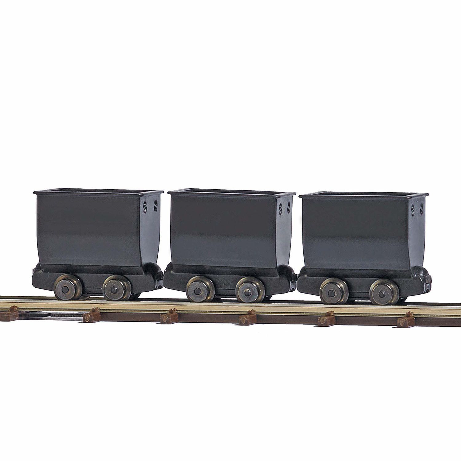 3 schwarze Bergwerksloren. Zugbildung mit weiteren Loren und der Grubenlokomotive durch magnetische Kupplung. Länge je Wagen: 19 mm.