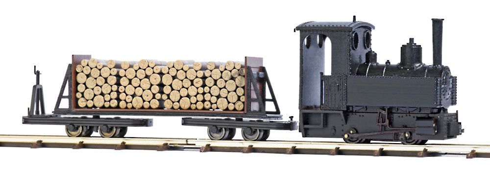 Feldbahnlokomotive Gmeinder 15/18 PS in offener Ausführung mit 2 Inhalt: Feldbahndampflokomotive Decauville Typ 3 und ein Drehgestell-Stirnwandwagen mit Bremserbühne und Holzladung (Länge: 70 mm), 8 Bogengleise Radius 115 mm, 1 gerades Gleis und 1 Anschlussgleis je 133,2 mm. Inkl. Batteriekasten mit Schalter (Vorwärts/Rückwärts/Stopp).