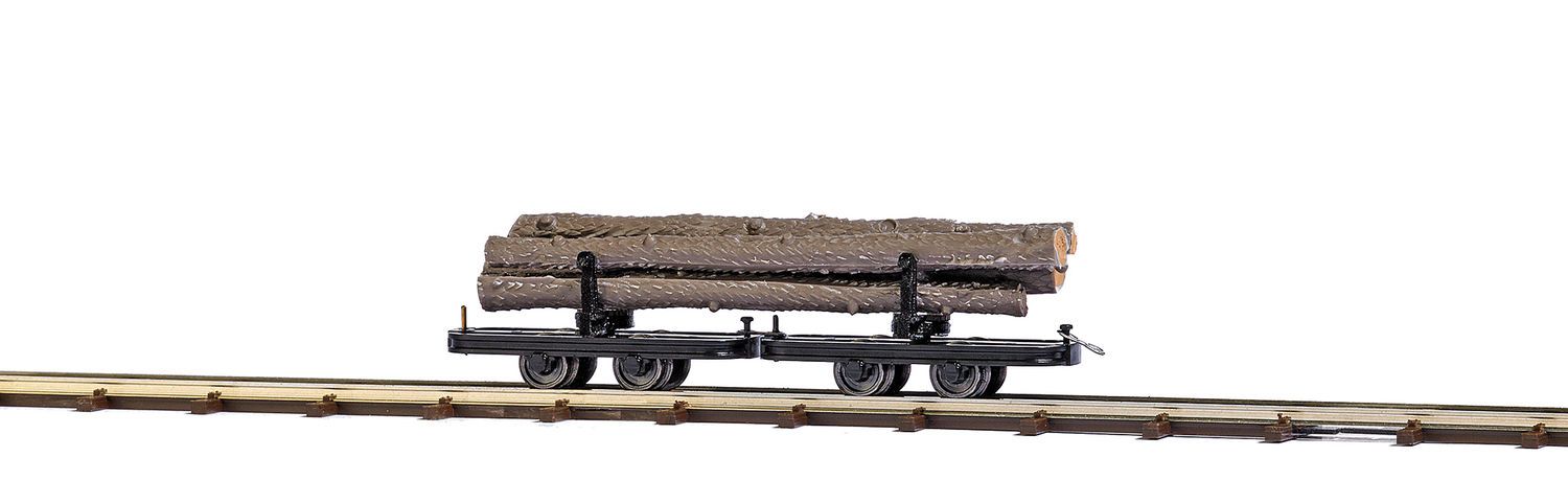 Langholztransport auf zwei Drehgestellen. Länge: 58 mm<br><br>Dieser Feldbahnwagen ist mit vorbildgetreuen Hakenkupplungen ausgestattet und daher auch mit den Loks und Mannschaftswagen aus dem Busch Grubenbahnsortiment kompatibel.