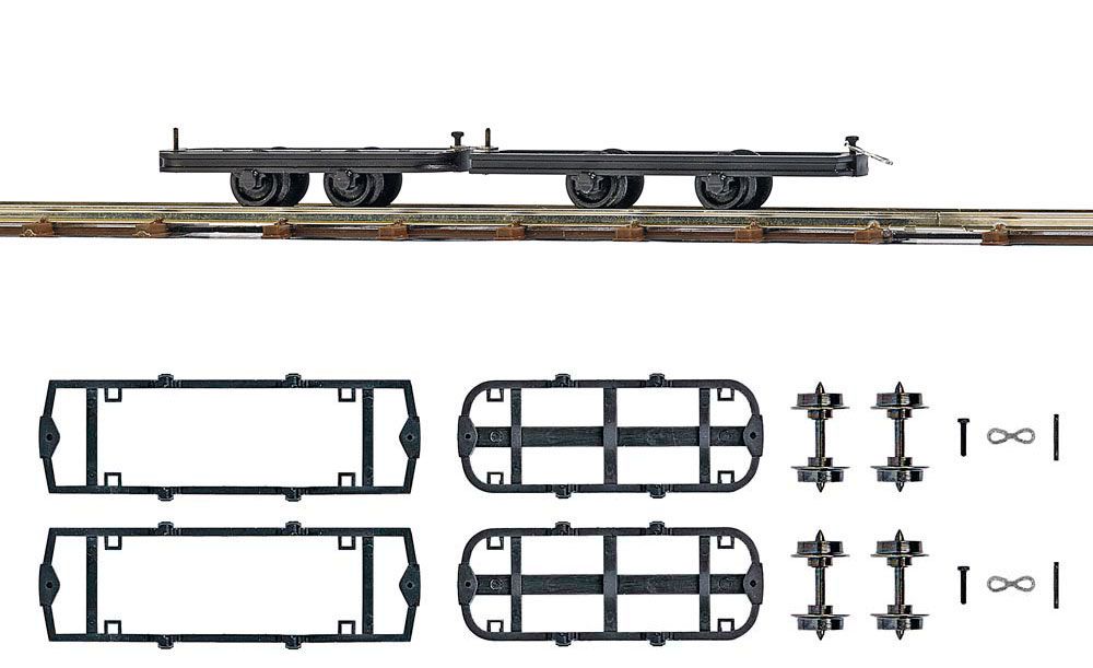 2 Fahrwerke (Bausatz) für den Bau von wahlweise 2 langen oder 2 kurzen (oder je 1 langer und kurzer) Feldbahnwagen mit individuellem Aufbau oder als Ersatzfahrwerke. Mit dunkel brünierten Metallradsätzen und Kupplungen. Langes Fahrwerk: 36 mm, kurzes Fahrwerk: 29 mm lang.