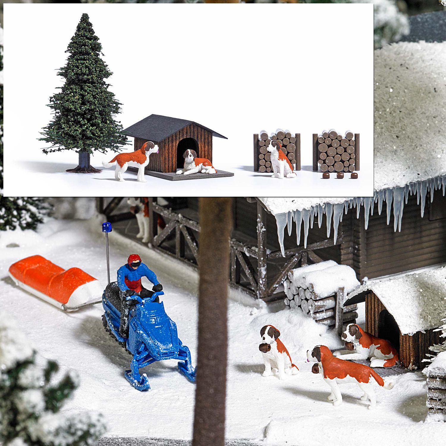 3 Bernhardinerhunde in sitzender, liegender und stehender Position mit passendem Zubehör: Erste-Hilfe-Rumfässchen, Holzstapel, Edeltanne mit Wurzelfuß (50 mm hoch) und Hundehütte aus echtem Holz.