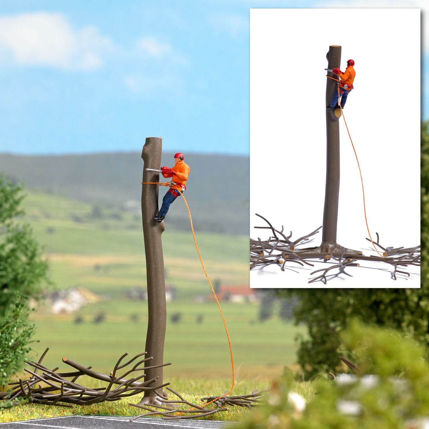 Szene einer Baumabtragung mit kommunalem Mitarbeiter in Sicherheitskleidung und mit Kettensäge und abgeschnittenem Astwerk.<br><br>Action Set für die realistische Belebung Ihrer Modellwelt. Mittelpunkt ist das vorbildgetreue Modell eines Gerätes oder einer Maschine mit einer Figur in passender Position (bemaltes Fertigmodell) und viel Zubehör.