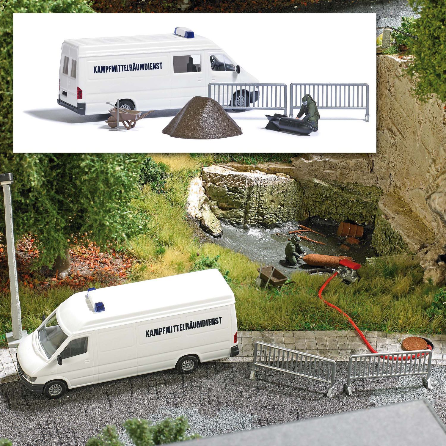 Action Set für die realistische Belebung Ihrer Modellwelt.<br><br>Szene für eine Bombenentschärfung. Inklusive Mitarbeiter des Kampfmittelräumdienstes bei der Arbeit, Schubkarren, Werkzeug, Sandhaufen, Absperrungen und Fliegerbombe. Mit Mercedes-Benz Sprinter »Kampfmittelräumdienst«.