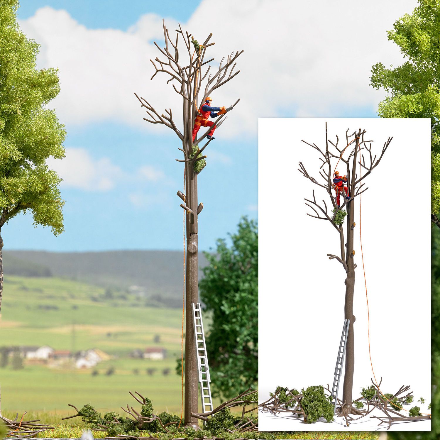 Baumschnitt-Szene mit kommunalem Mitarbeiter in Sicherheitskleidung, der mit der Kettensäge die Baumpflege am hohen Baumstamm von oben nach unten vornimmt. Mit Leiter und abgeschnittenem Astwerk.<br><br>Action Set für die realistische Belebung Ihrer Modellwelt. Mittelpunkt ist das vorbildgetreue Modell eines Gerätes oder einer Maschine mit einer Figur in passender Position (bemaltes Fertigmodell) und viel Zubehör.