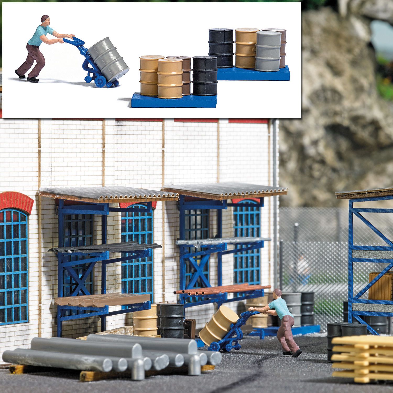 Action Set für die realistische Belebung Ihrer Modellwelt. Spezieller Fasstransportwagen mit 9 Fässern, Ölauffangwannen und Arbeiter.