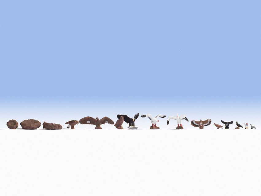 Vögel geeignet für Spurweite: H0 3 Nester und 12 Vögel Weißkopfadler Steinadler mit Nest Bussard mit Nest Störche mit Nest Eule Raben Tauben Hersteller: Noch