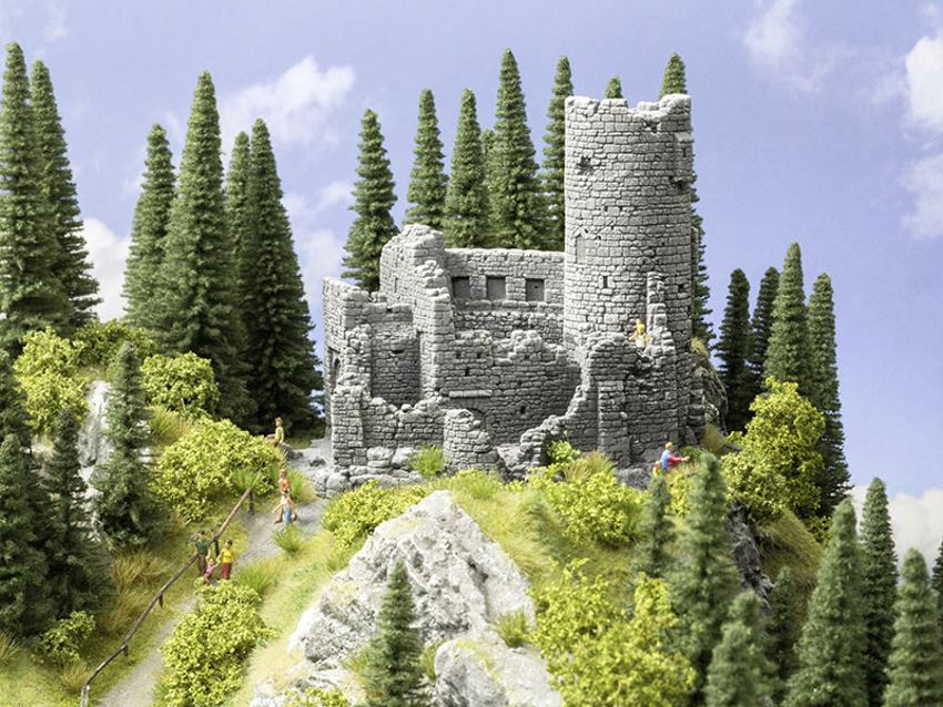 Gibt es ein eindrucksvolleres Highlight auf einer Modelleisenbahnanlage als eine imposante Burgruine, die hoch oben auf einem Felsen tront? Wir denken nein! Deshalb freuen wir uns sehr, dass es uns 2017 nach vielen Jahren wieder gelungen ist, den Meister der Gips-Modellierkunst, Herrn Manfred Luft, dazu zu bewegen, eine Burgruine für das NOCH Sortiment zu modellieren. Die imposante Ruine mit dem runden Turm wird aus dem bekannten NOCH Struktur-Hartschaum hergestellt und ist aufwändig handkoloriert. Das hochwertige Modell ist sehr leichtgewichtig und einfach weiter zu bearbeiten.