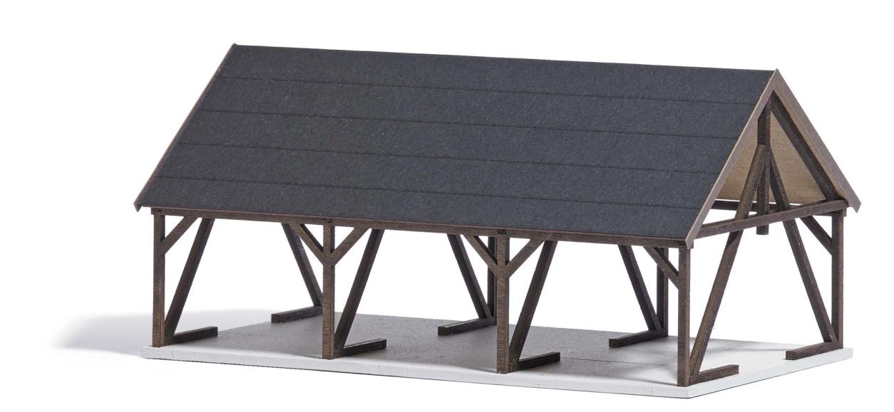 Im Mittelpunkt des Holzlagers steht der Unterstand aus echtem Holz. Für die Bestückung der Halle und des großen Holzlagerplatzes ist reichlich Zubehör enthalten: Baumstämme, Holzstapel in verschiedenen Größen, Holzbalken, Schnittgut und gehobelte Bretter aus echtem Holz. Mit Sägespänen, Werkzeug und Schubkarren. Bausatz. <br><br>Größe Lagerhalle: 145 x 90 mm, 70 mm hoch