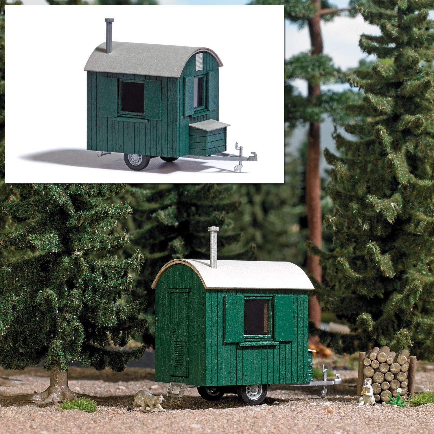 Bausatz für einen Anhänger als Forstwagen aus echtem Holz. Alle Teile fertig koloriert. Realistische Nachbildung des Tonnendaches mit Ofenrohr. Deichsel mit filigraner Anhängerkupplung. <br><br>Größe: 49 x 27 mm Höhe: 40 mm.