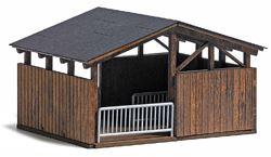 In einem »Offenstall« können sich größere Tiere, z.B. Pferde, zwischen dem überdachten Bereich und der Weide bzw. dem Außengelände frei bewegen. Wie im Original ist dieses Modell aus echtem Holz mit bereits fertig kolorierten Holzteilen gefertigt. Mit Giebeldach und Nachbildung von Metallgittern als Tore und Boxen Stallinneren. Bausatz. <br><br>Größe: 69 x 53 mm, 39 mm hoch<br><br><strong>Thema »Wildpark«</strong><br>In wunderschöner Natur die heimische Tierwelt hautnah erleben - Wildparks sind ein beliebtes Ausflugsziel, um Hirsche, Rehe, Steinböcke, Wildschweine, Wisente, Wölfe, diverse Vogelarten u.v.m. in ihrem natürlichen Umfeld zu beobachten. Sie liegen häufig in Naturschutzgebieten. Oftmals ergänzen Streichelzoos mit Kleintieren und Spielplätzen das Freizeitangebot. Liegt der Schwerpunkt bei afrikanischen Tieren wird auch die Bezeichnung Safaripark verwendet. <br><br>Die Vielfalt dieses Themas wird von Busch mit der Wildpark-Serie perfekt in Szene gesetzt. Die Gebäude und Zubehörartikel, vom Kassenhaus bis zum Wildpark Ausgestaltungs-Set, bieten heimatlichen und exotischen Tierarten gleichermaßen eine adäquate Behausung. Nahezu unendlich ist der Variantenreichtum, der sich für Modellbahnanlagen und im Dioramenbau bietet. Auch ein Vogelpark, ein kleiner Zoo oder Tierpark kann realistisch dargestellt werden. <br><br>Folgende Artikel sind aus Serie »Wildpark« lieferbar:<br><br><ul><li>1580 Kassenhaus</li><li>1581 Eulenvoliere</li><li>1582 Kleintierstall</li><li>1583 Gehege</li><li>1584 Offenstall!</li><li>1585 Aussichtsturm</li><li>1586 Toilettenhaus!</li><li>1587 Streichelzoo</li><li>1588 Aussichtsplattformen</li><li>1589 Wildpark-Ausgestaltungs-Set</li></ul><br><br>Zudem befinden sich im Busch-Sortiment bereits viele passende Artikel, die das Thema hervorragend ergänzen wie z.B. Stahlrohrzaun 1022 und Gartenzaun 1020, Spielplatz 1458, Spielhäuser 1486, Spielburg 1487 oder der »Fliegende Storch« 5481, der mit Motorkraft sein Nest umkreist.