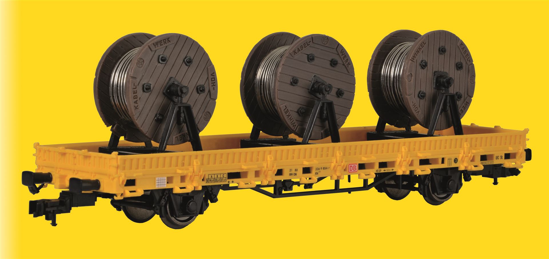 H0 Niederbordwagen mit 3 Kabelrollen Gleisbau, Fertigmodell Ein Niederbordwagen beladen mit 3 Kabeltrommeln. Passend zur Serie der Gleisbaufahrzeuge. Werksseitig mit Gleichstrom-Radsätz...