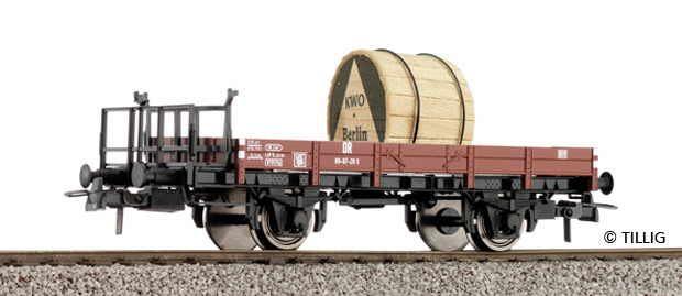 Niederbordwagen mit Kabelrolle ( Nenngröße H0 ) Epoche III (bis ca. 1970) der Deutsche Reichsbahn; DDR (bis 1994) (ex Erfurt), mit neuer Betriebsnummer, beladen mit Kabelrolle "KWO Berlin" Tech...
