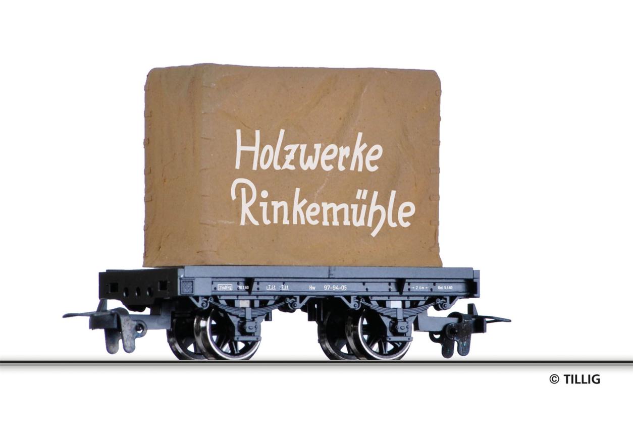 Drehschemelwagen der DR, mit Ladung unter Plane der Holzwerke Rinkemühle Ep. III Neuheit 2016 Epoche III Hauseigene Kupplungsaufnahme Nenngröße H0e, Maßstab 1:87, Spurweite 9mm Altersfreigabe Nich...
