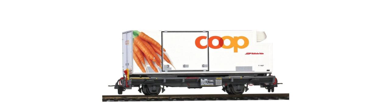 H0m RhB Lb 7877 mit Coop-Container "Karotte" Hersteller: Bemo