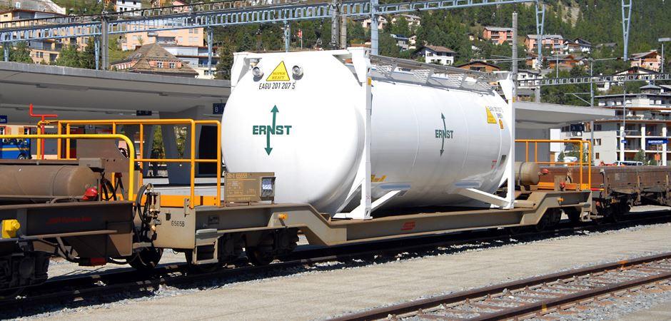 H0m RhB Sbk-v 7712 Containerwagen "Ernst" Ep.V-VI LüP: 183 mm Um zwei weitere Farbvarianten ergänzen wir die auf Niederflur-Drehgestellwagen Sbk-v 7701-7715 transportierten Zementsilobehälter. ...