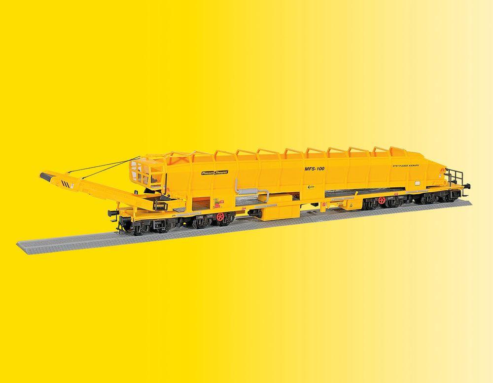Bausatz. Bei vielen Arbeiten am Gleis, wie z. B. der Bettungsreinigung, fallen beachtliche Mengen an Abraum an. Während man früher die Rückstände seitlich am Bahnkörper ablagerte, muss heute der Aushub zu einer geeigneten Entladestelle transportiert werden. Aber auch der rasche und flexible Transport von neuem Schotter zur Baustelle ist eine Aufgabe, die einer praktikablen und wirtschaftlichen Lösung bedarf. Die MFS sind die ideale Ergänzung für Ihre Gleisbaustelle! Der Boden des Speicherbehälters ist als durchgehender Fördergurt ausgebildet. Dieser ermöglicht ein kontinuierliches Füllen des Silos oder das Durchfördern des Materials. Das Übergabeförderband an der Stirnseite der Maschine ist nach rechts und links um 45 schwenkbar. Es entlädt das Material entweder in die nächste MFS-Einheit oder seitlich an geeigneter Stelle.Die MFS-Einheiten eignen sich für jede Art von Schüttgut und können zu Materialzügen beliebiger Länge zusammengestellt werden. Die Energie dazu liefert ein Dieselmotor. Dazu passt H0 Schutzwagen mit Auflage für MFS 100 und Container GleisBau, Fertigmodell Art. 26264.