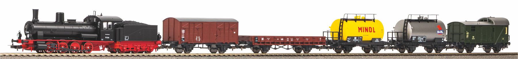 In der Epoche III dominierte die Dampftraktion. So führt in diesem Start-Set eine Lok der Baureihe 55 einen Güterzug mit fünf Wagen an, darunter einer der einst so typischen Güterzug-Gepäckwagen.