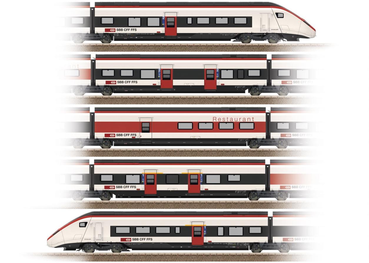 5-teilige Grundgarnitur. Restaurantwagen G und die beiden links und rechts angeordneten Mittelwagen F und H sind über die Jakobs-Drehgestelle fest miteinander gekuppelt. Mit Digital-Decoder und umfangreichen Geräusch- und Lichtfunktionen. Geregelter Hochleistungsantrieb mit Schwungmasse im Restaurantwagen zentral eingebaut. Alle 4 Achsen in beiden Jakobs-Drehgestellen links und rechts des Restaurantwagens über Kardan angetrieben. Haftreifen. Führerstände der Endwagen mit Inneneinrichtung. Fahrtrichtungsabhängige Stromversorgung über den jeweils vorderen Endwagen. Kulissenführung in den Jakobs-Drehgestellen. Fahrtrichtungsabhängig wechselndes Dreilicht-Spitzensignal und zwei rote Schlusslichter, konventionell in Betrieb, digital schaltbar. Umschaltbar auf ein weißes Schlusslicht (Schweizer Lichtwechsel). Weitere separat schaltbare Lichtfunktionen. Serienmäßig eingebaute Innenbeleuchtung. Innenbeleuchtung wird versorgt über die durchgehende elektrische Verbindung des ganzen Zuges. Zusätzlich Führerstand- und Fahrpult-Beleuchtung jeweils separat digital schaltbar. Gesamte Beleuchtung mit wartungsfreien warmweißen und roten Leuchtdioden (LED). Pantographen auf den Mittelwagen F und H jeweils als Digital-Funktion separat heb- und senkbar. Maßstäbliche Nachbildung. Befahrbarer Mindestradius 360 mm. Länge der Grundgarnitur ca. 112 cm.