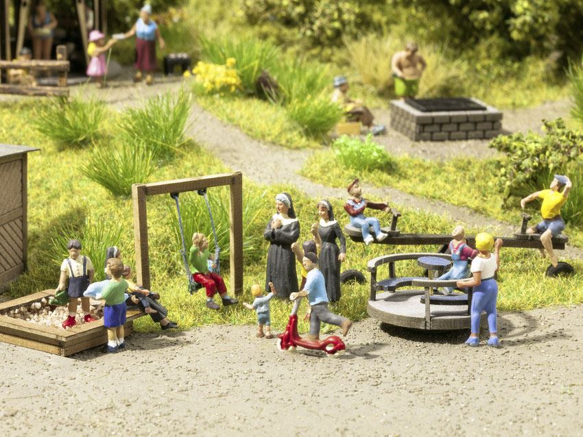 Spielgeräte geeignet für Spurweite: H0 Karussell: 2,2 x 2,2 cm, 1,1 cm hoch Wippe: 4,2 x 6 cm, 1,5 cm hoch Schaukel: 2,1 x 0,2 cm, 2,3 cm hoch Hersteller: Noch