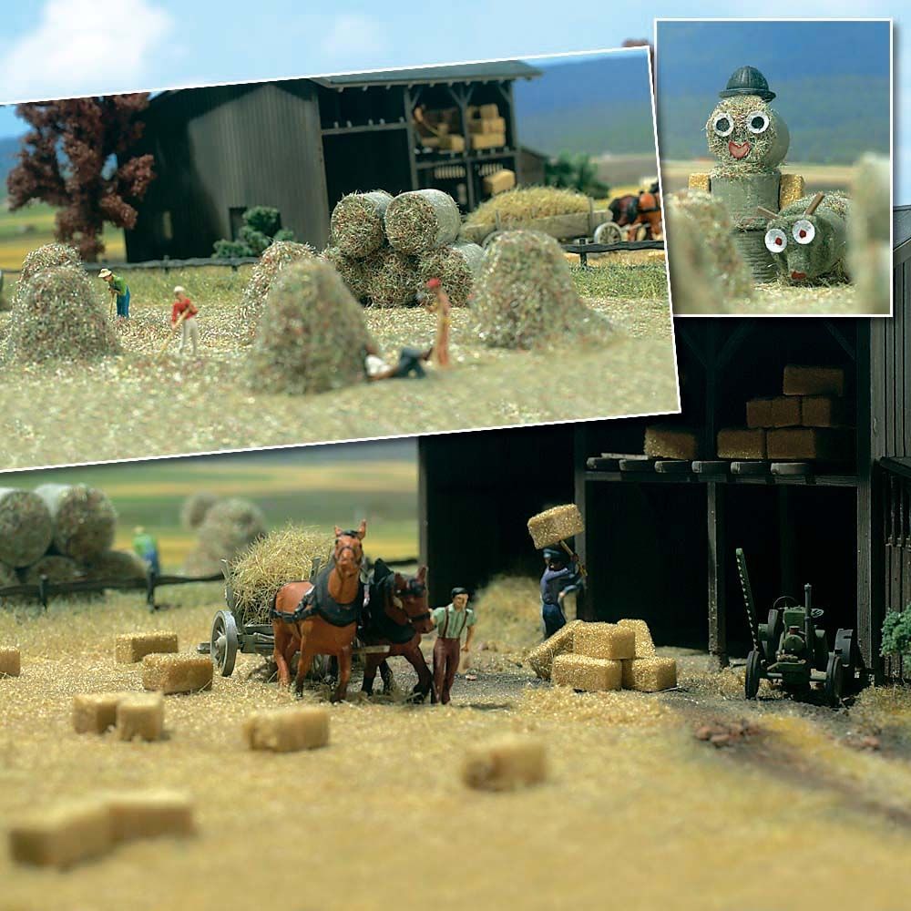 18 Heuballen, 6 Strohhaufen und 18 Strohrollen. Inklusive Spezialbeflockung für strohige Oberflächen der Ballen und Anleitung für die Gestaltung von Strohballenfiguren wie man sie zur Erntezeit häufig auf den Feldern sieht.