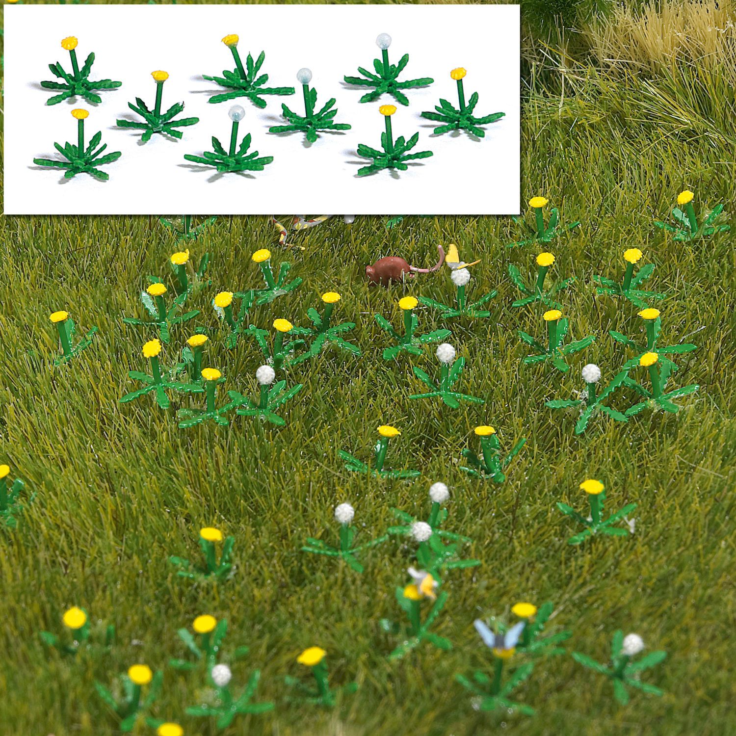 Bausatz für 60 blühende Löwenzahn-Pflanzen und 60 Pusteblumen. Inklusive Grasfläche (ca. 148 x 105 mm) zum Anlegen einer kleinen Löwenzahnwiese. Die Löwenzahnpflanzen können auch einzeln in Wege ritzen, an Mauern usw. gepflanzt werden. Zum Beleben enthält das Set Kleintiere (Schmetterlinge, Frösche, Ratten, Insekten usw.) zum selbst Bemalen.