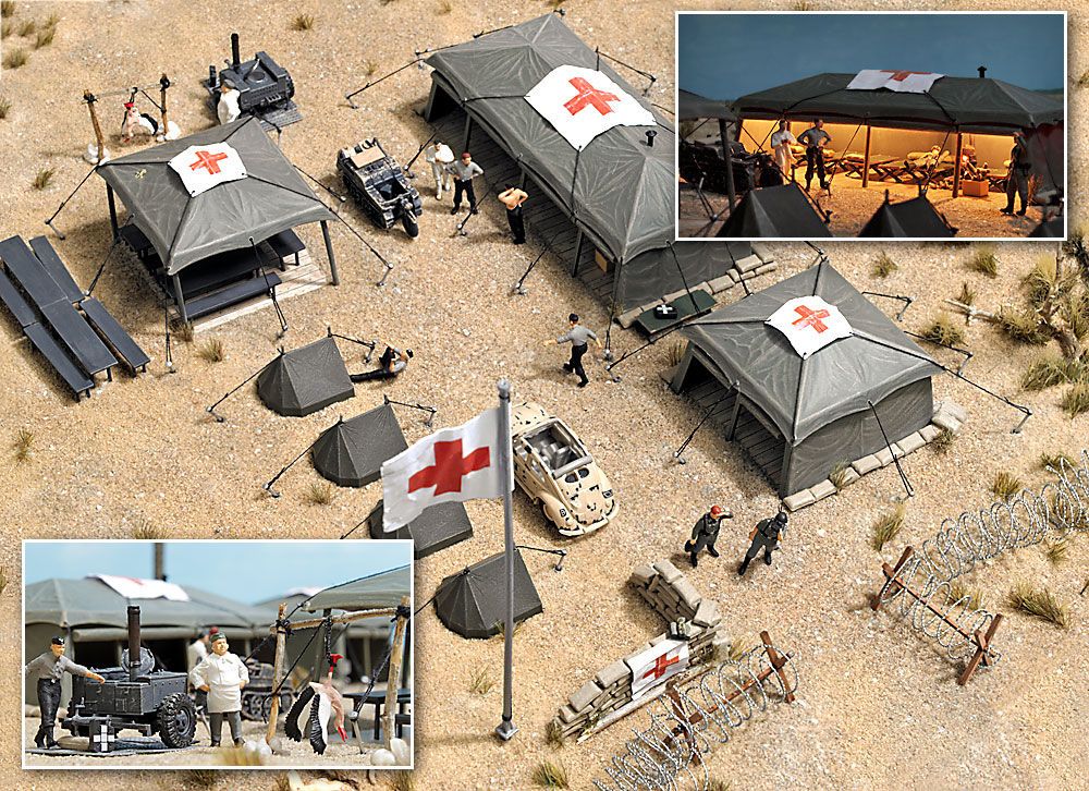 Mit dem Inhalt dieses Bausatzes kann ein komplettes Feldlazarett aufgebaut werden. Mit großem Zelt als Krankenlager, einem Behandlungszelt, einem Verpflegungszelt sowie vier Zweimannzelten (»Dackelgarage«) zum Übernachten. Weiterhin enthalten: Feldbetten aus echtem Holz, Tische und Sitzgarnituren, Trage, Sandsäcke, Stacheldrahtumzäunung, Holzabsperrungen (»Spanische Reiter«), Fahnenmast mit Fahne und Feldküche mit Sandblechen. Passende Ergänzung: VW Passat Variant Sanitätsfahrzeug Nr. 5621.