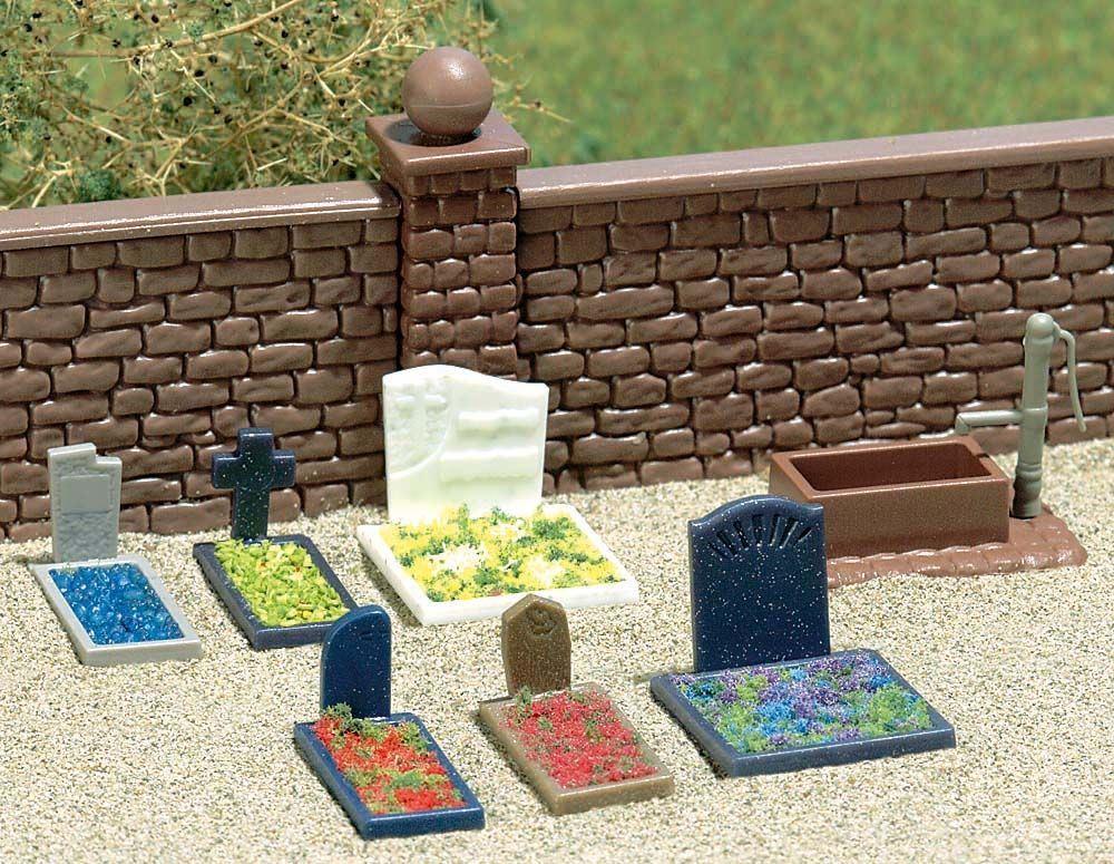 Inhalt: 6 Gräber und 1 Brunnen.<br><br>Vorbildgetreu zusammengestelltes Ausgestaltungsdetail frei nach dem Motto: So spielt das Leben. Zum direkten Einbau in Ihre Modellbahnanlage. Lieferung in Blisterbox.