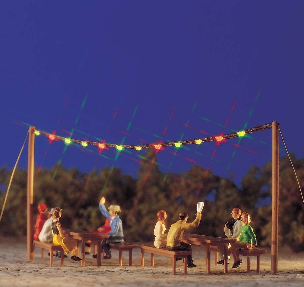Bunte Lichterkette mit 12 Mini-Leuchtdioden, 2 Holzmasten, 4 Bänken und 2 Tischen.