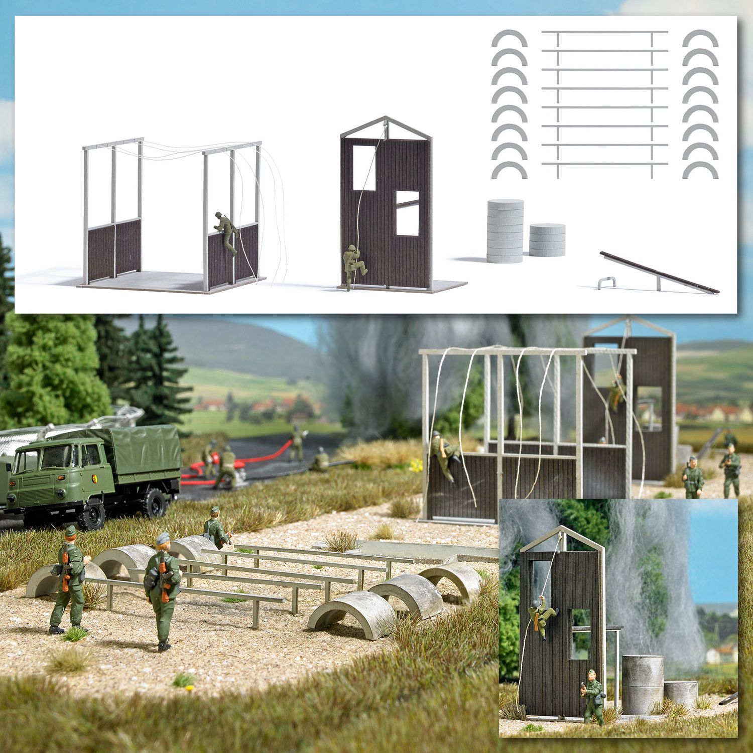 Die Sturmbahn ist eine militärische Ausbildungsanlage, mit deren Hilfe Körperkraft, Ausdauer, Beweglichkeit und Schnelligkeit der Soldaten geschult werden soll. Sie besteht aus verschiedenen Hindernissen, die vom einzelnen Soldaten oder im Gruppenverband überwunden werden müssen. Bei diesem Bausatz sind die wesentlichen Elemente einer Sturm- und Gefechtsbahn originalgetreu dargestellt: Kriech- und Übersteigehindernis aus Betonröhren und Querbalken, Anlage mit Horizontaltau, Giebelwand mit anschließendem Balken und Betonelementen sowie eine Wippe. Mit 2 NVA-Soldaten in verschiedenen Positionen zum selbst Bemalen. Empfohlene Aufbaulänge der Anlage: ca. 500 mm.