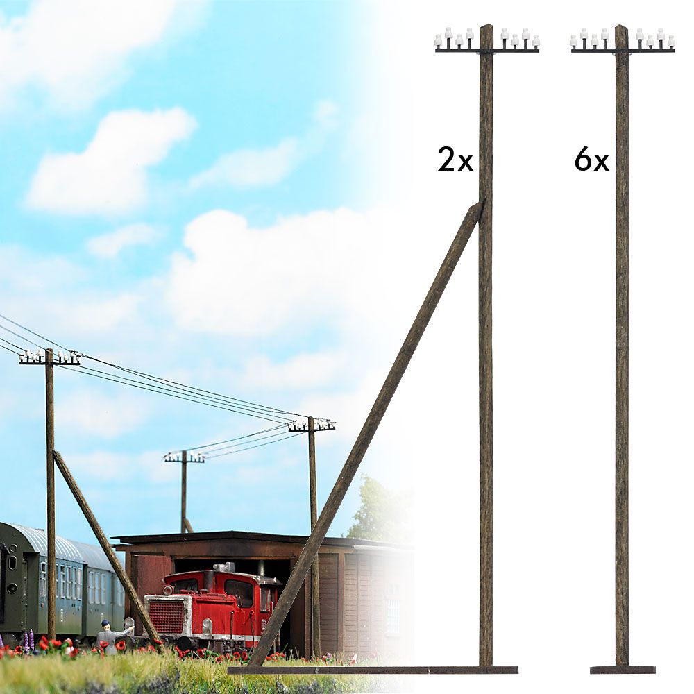 Bausatz für 8 Telegrafenmasten aus Echtholz. Mit filigranen Isolatoren in Porzellanoptik. 6 Masten gerade, 2 Masten mit Seitenausleger. Höhe der Masten ca. 93 mm.