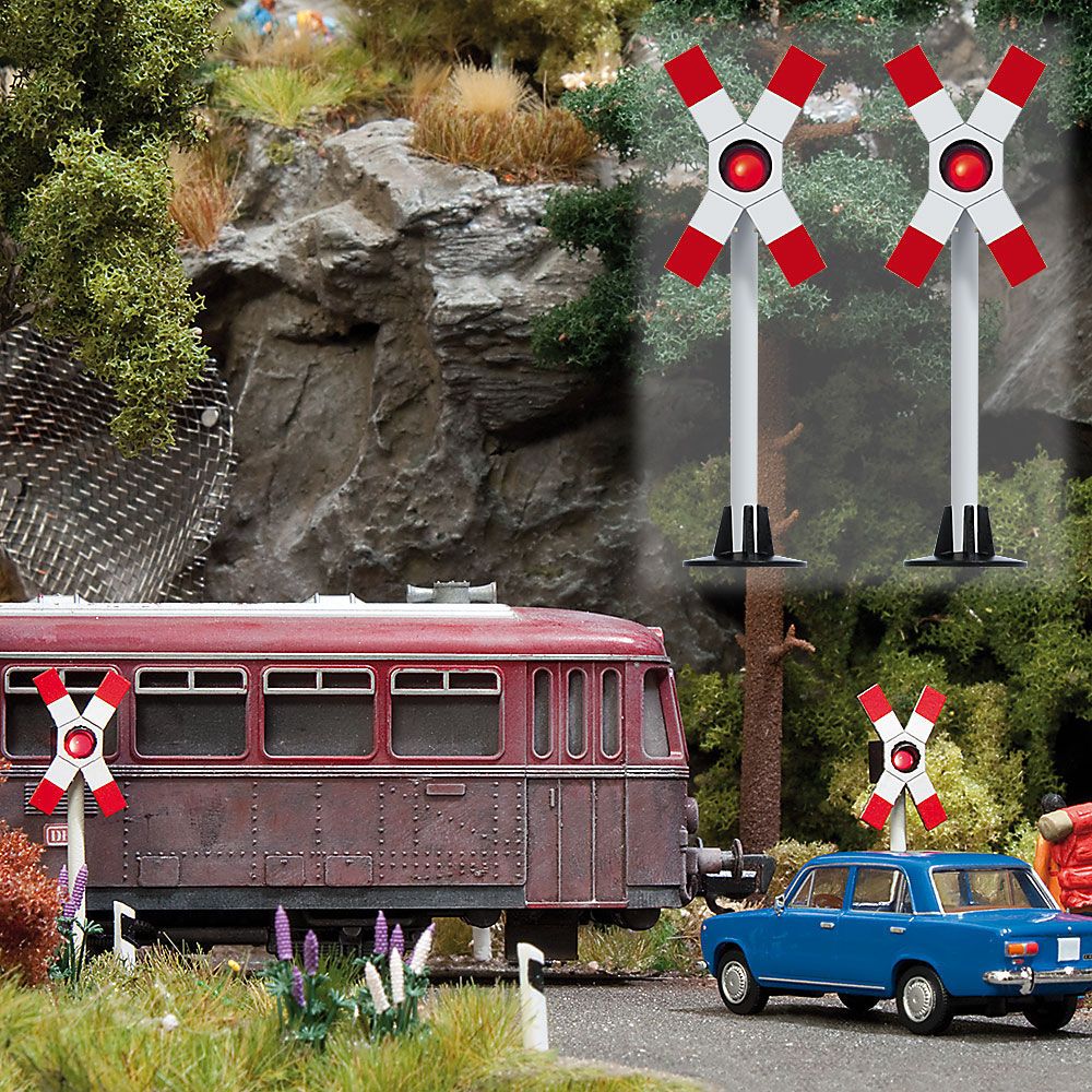 2 typische Andreaskreuze wie sie in der ehemaligen DDR zum Einsatz kamen und auch heute noch Verwendung finden. Eine elektronische Blinkschaltung und LEDs sorgen für wartungsfreien Dauerbetrieb. In Verbindung mit IR-Lichtschranke und Zeitschalter (Nr. 5961) können die Warnblinker durch Zugannäherung automatisch eingeschaltet werden.