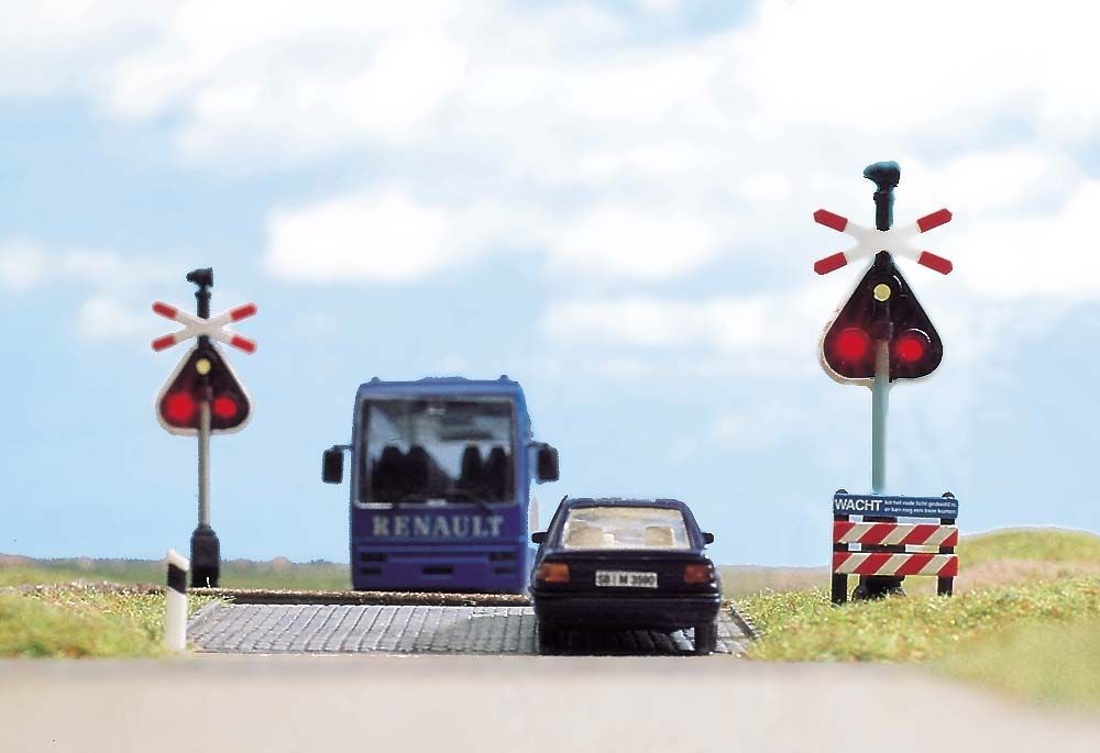 Komplett-Set: 2 Warnblinker mit je 2 roten und einer gelben Leuchtdiode, elektronische Blinkschaltung und Andreaskreuzen für ein- und zweigleisige Bahnübergänge. Einbaufertig und funktionsgeprüft.