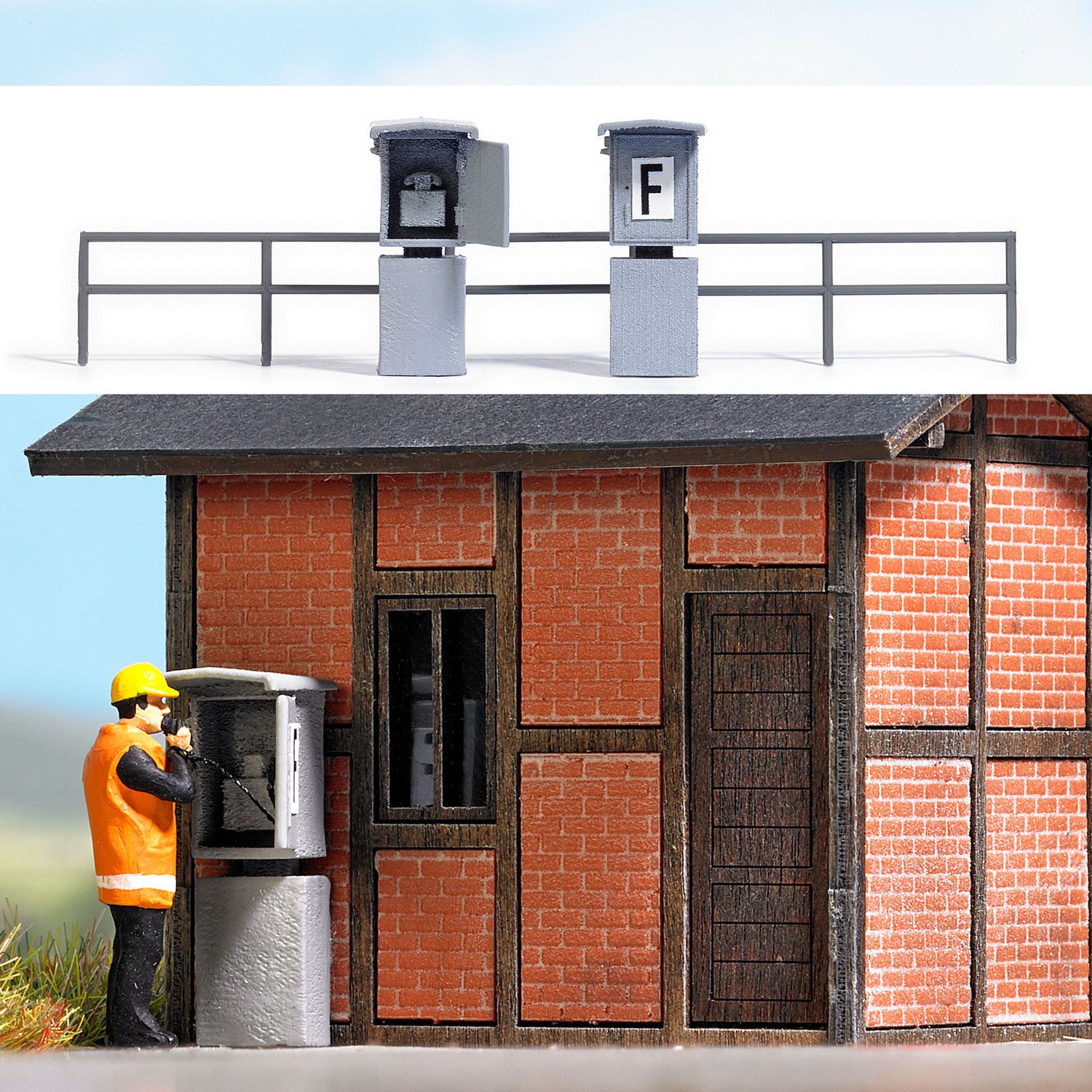 Ein Signalfernsprecher geschlossen und einer mit geöffneter Tür und Innenausstattung. Inkl. passendem Geländer (Länge: 90 mm).<br><br><br><br>.