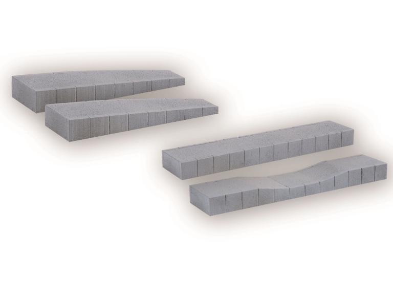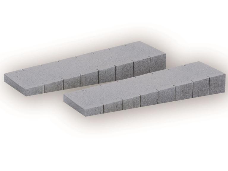 Bahnsteig Epoche III / IV, gebogene Enden für Radius (R2) 437 mm, für Märklin C-Gleis geeignet für Spur: H0 je 1 rechtes und 1 linkes Ende, für Märklin C-Gleis , je 12 cm lang, 3,8 cm breit, verjüngend auf 2 cm, 1,5 cm hoch, abfallend auf 0,5 cm Mit dem neuen Bahnsteigsystem aus dem bekannten NOCH Struktur-Hartschaum bieten wir den Freunden des MÄRKLIN C-Gleises eine perfekte und gleichzeitig sehr einfache Methode um realistische Bahnsteige zu erbauen. Die Bahnsteige sind ideal für alle Epoche III und IV Bahnanlagen geeignet. Das System umfasst vier Komponenten: Gerade Bahnsteig, 18 cm lang,Gerade Bahnsteig mit Gleisabgang, 18 cm lang, Gerade Bahnsteigenden (zwei Stück), je 12 cm lang, Bahnsteigende links und Bahnsteigende rechts, je 12 cm lang Durch die Kombination dieser Elemente lassen sich alle erdenklichen Bahnsteigsituationen im Modell erbauen: Die Hartschaum-Bahnsteige können einerseits in Situationen eingesetzt werden, in denen ausreichend Platz für lange gerade Bahnsteige vorhanden ist.